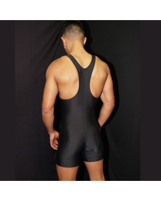 ropa luchador hombre, body enterizo color negro, vista de frente.
